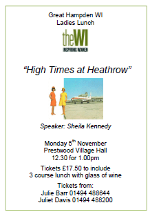 Great Hampden WI are holding a ladies lunch on Monday 5th November in Prestwood Village Hall. All welcome. The event includes a three-course lunch with wine, and a talk ‘High Times at Heathrow’ by Sheila Kennedy. Details on this poster. More information and tickets from Julie Barr (01494 488644) and Juliet Davis (01494 488200).