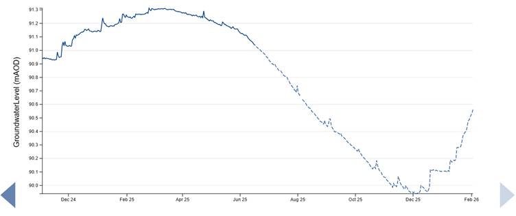The graph shows the readings for the borehole at the bottom of Cryers Hill between November 2024 and the beginning of February 2026. The borehole has equipment which measures and reports on the groundwater level and that is what we see below. The levels detailed on the left of the graph are what are call datum levels; the figures compare to a reference point. So, for us in the valley, a figure of 90.0 metres shows the groundwater levels here are relatively low and the stream won’t be running in the vicinity of the pumping station.