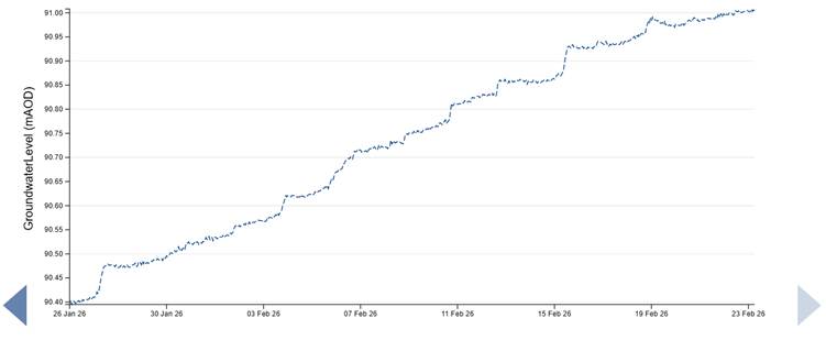 “At the beginning of February 2026, the graph is on a steep upward slope, but we are still some way short of the 91 metre figure. Beyond the end of February and assuming we get some relief from this rain, then the stream may not rise at all and we also may not see the groundwater levels putting pressure on the sewage system. Maybe we will not see any sewage discharges this year also. “