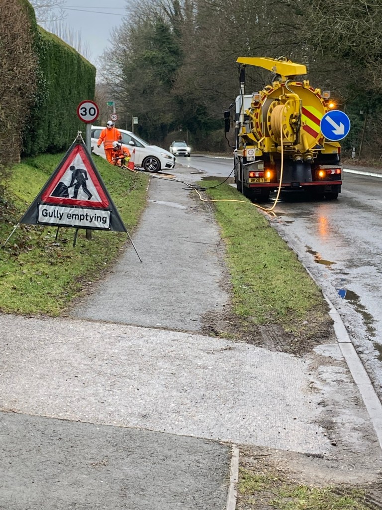 I happened to be out in Valley Road on a walk recently and spotted Bucks CC engineers clearing the problematic drains at the foot of Trees Road – see the pic.