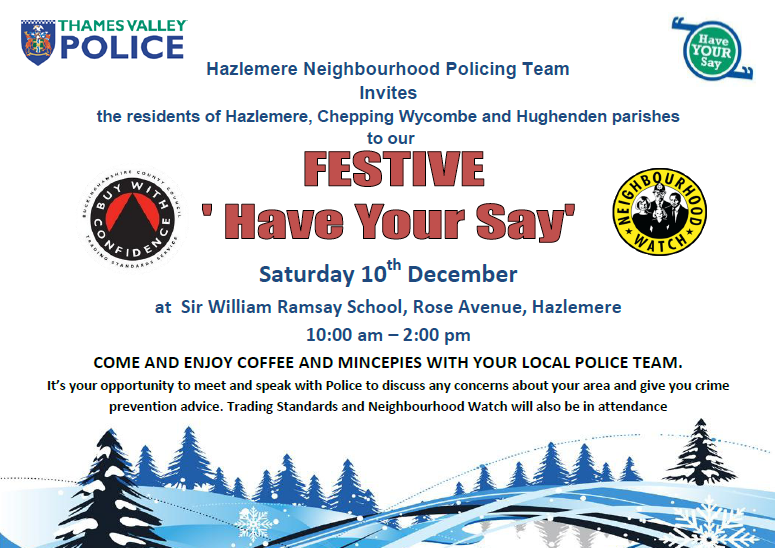 The next ‘Have Your Say’ Neighbourhood Police Officers’ surgery will be at Sir William Ramsey School, Rose Avenue, Hazlemere from 10am to 2pm on Saturday 10th December 2011. The Hazlemere Neighbourhood Policing Team invite you to drop in for coffee and mince pies and to discuss any concerns you may have regarding local policing. Trading Standards and Neighbourhood Watch will also be there.